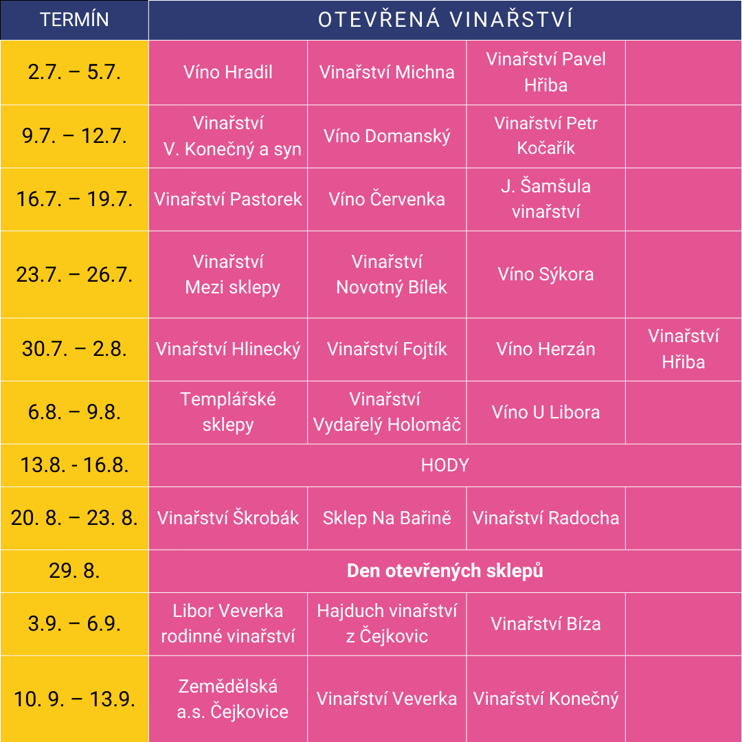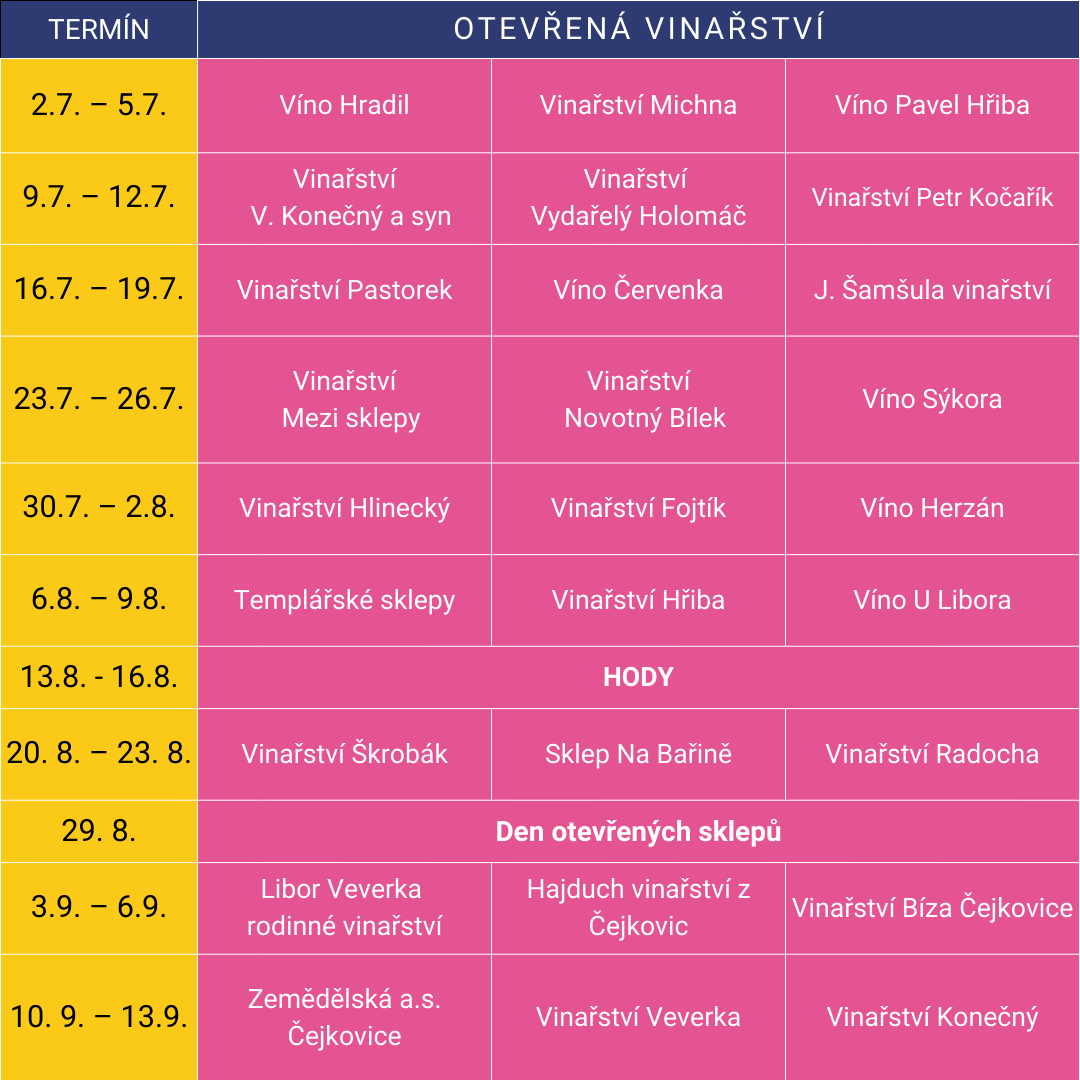 Po celé léto budou otevřeny alespoň 3 sklepy. Jediný víkend, kdy děláme vyjímku, je ten hodový! To je v naší obci událost roku a ani my vinaři si ji nenecháme ujít. Srdečně zveme i Vás!