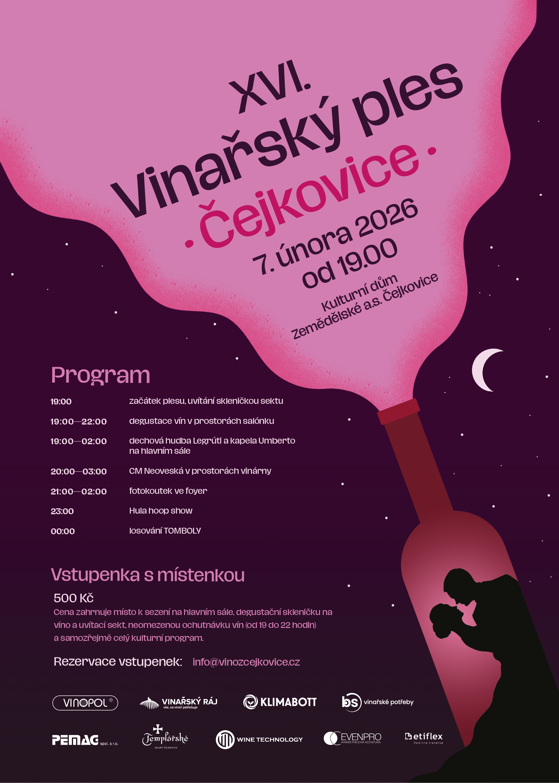 (Cena zahrnuje místo k sezení na hlavním sále, degustační skleničku na víno a uvítací sekt, neomezenou ochutnávku vín (od 19 do 22 hodin) a samozřejmě celý kulturní program.)